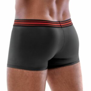 Enge betonende Pants von Svenjoyment im edlen schwarzen Mattlook mit auffälligem roten, unterlegtem Reißverschluss im Beutel und breitem gestreiften Webgummibund. Rundum weich und elastisch für maximalen Tragekomfort.