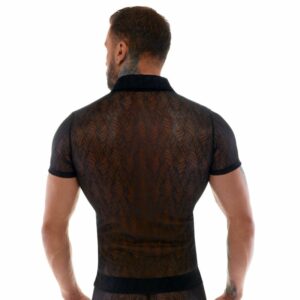 Enges, betonendes Halbarm-Hemd von Svenjoyment aus feiner weicher Stretch-Spitze. Mit Kragen und durchgehender Knopfleiste vorne.