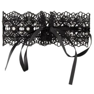 Schwarzes, gesticktes Halsband mit weißen Perlen und Strasssteinen besetzt. Hinten mit Satinschleife zum Binden. Ca. 36 cm lang, ca. 5 cm hoch. 100% Polyester.