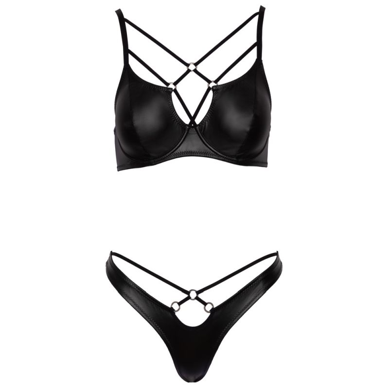 Bügel-BH und Riostring im Set von Cottelli LINGERIE. Edler schwarzer Mattlook mit dekorativen Details aus Stretchriemen und silberfarbenen Ringen im Dekolleté und am vorderen Stringbund. Rundum elastisch für passformsicheren komfortablen Sitz. BH mit verstellbaren Trägern und Hakenverschluss im Rücken.