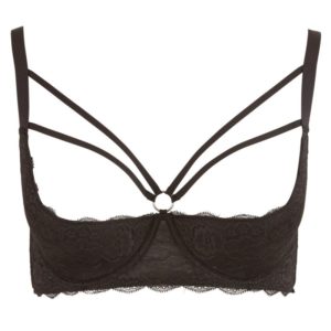 Leicht gefütterte Bügel-Hebe mit Zierring und raffinierten Riemchen-Details im Dekolleté. Komplett aus weicher, elastischer Blütenspitze.