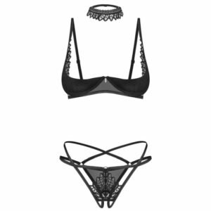 Schwarzes 3-teiliges Set Donarella von Obsessive mit Bügel-Hebe, String ouvert und Halsband. In raffinierter Schnittführung mit aufwendigen Stickerei-Einsätzen. Rundum weich und elastisch für hohen Tragekomfort. Die Bügel-Hebe stützt den freiliegenden Busen perfekt. Das kleine Schmuckelement zwischen den Cups fängt den Blick. Der Hakenverschluss im Rücken und die Träger sind passend verstellbar. Der schöne String mit stylischen Stretchbändern ist im Schritt einladend offen. Das verstellbare, eng anliegende Halsband komplettiert den erotisch eleganten Look!