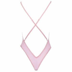 Extra tief dekolletierter Body von kissable aus feinem roséfarbenem Powernet mit aufwendiger Floralstickerei Ton in Ton. Rundum weich und elastisch für höchsten Tragekomfort. Die verstellbaren Träger kreuzen sich im Rücken.