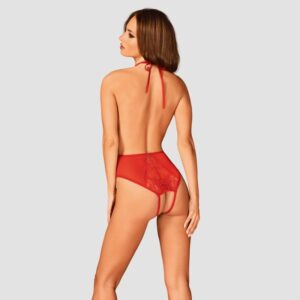 Roter Body ouvert Dagmarie von Obsessive aus Stretchtüll und feiner Spitze. Rundum weich und elastisch für vollen Komfort. Mit Spitzen-Halsband als verstellbarer Neckholder zum Binden. Vorne großzügiger Cut-out, der Rücken bleibt frei. Im Schritt verführerisch offen.