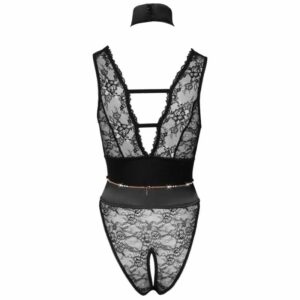 Atemberaubend geschnittener Body von Abierta Fina mit einladend offenem Schritt. Komplett aus feiner Spitze gefertigt, die sich weich anschmiegt. Der breite Tailleneinsatz aus festem Stretchsatin formt dazu eine schöne Silhouette. Vorne extra tief dekolletiert, verführt auch die Rückansicht mit einem tiefen V-Ausschnitt. Das breite Halsband und das Kettchengeschirr für Hals und Taille unterstreichen diesen erotisch eleganten Spitzenlook. Die mit Strass besetzten roségoldfarbenen Karabiner-Kettchen können auch abgenommen werden.