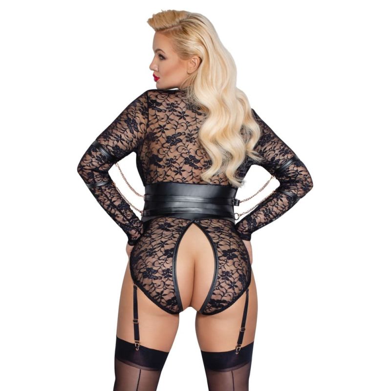 Langarm-Body von Cottelli BONDAGE aus weicher elastischer Spitze mit Mattlook-Einsatz rundum die Taille und roségoldfarbenen Elementen. Für fesselnde Lustmomente sorgen die vier Armfesseln, die mit ihren Karabinerketten an den seitlichen Ringen des Tailleneinsatzes befestigt werden können. Der Body ist in der Front, durch den Schritt und bis über den Po komplett offen und wird vorne nur von zwei Ringen zusammengehalten. Die verstellbaren Strapse sind vom Slip-Teil abnehmbar.