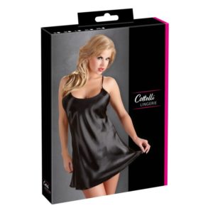 Kurzes Negligé aus schwarzem Glanz-Satin. Hinten tiefer Rückenausschnitt. Spaghetti-Träger im Rücken zu schließen und individuell verstellbar für perfekte Passform.