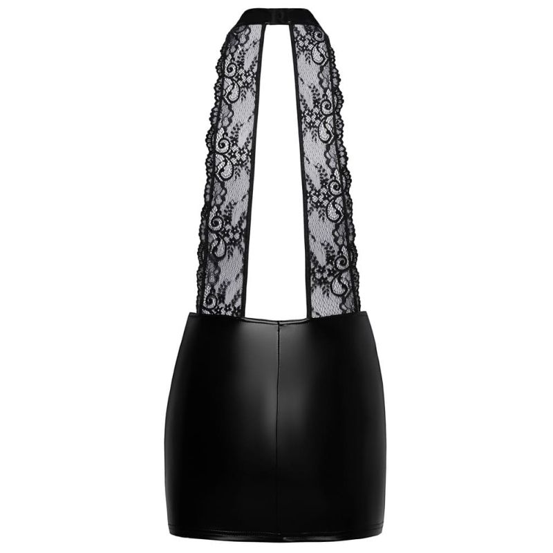 Kurzes enges Kleid von Noir im schwarzen edlen Mix aus zarter Spitze (Oberteil) und hochelastischem Powerwetlook (Rockteil). Das Spitzen-Oberteil ist vorne komplett offen, genauso wie im Rücken. Auch die Seiten bleiben komplett frei. Der Stehkragen-Neckholder hat einen Hakenverschluss im Nacken.