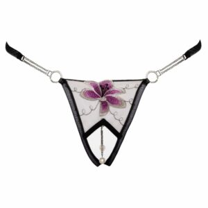 Riostring ouvert von Cottelli LINGERIE aus feinem Tüllnetz mit bildschöner Blüte und zarter Stickerei auf der verführerisch offenen Front. 2 schwingende kleine Kettchen mit Perlen schmücken und stimulieren – sind aber auch komplett abnehmbar. Stretchbund vorne jeweils seitlich mit 2 Strassketten und -ring. Hinten elastischer Powernet-Einsatz für passformsicheren Sitz.