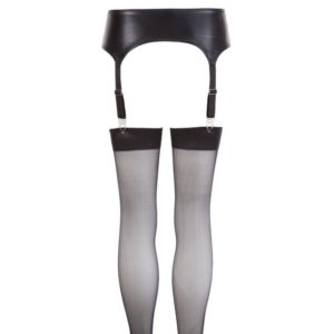 Wetlook-Strapsgurt komplett mit passenden Strümpfen im Set. Der Strapsgurt strahlt einen leichten Fetisch-Flair aus und die Metall-Strapse sorgen für sicheren Halt.