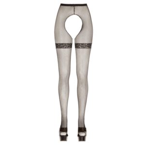Straps-Strumpfhose aus grobem Netzmaterial mit eingenähten Strumpfbändern aus Spitze. Im Schritt einladend offen.