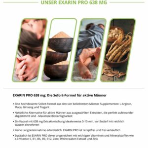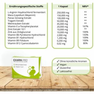 Veganes Nahrungsergänzungsmittel Exarin Pro speziell für den Mann aus ausgewählten Extrakten – perfekt aufeinander abgestimmt. Eine Kapsel enthält 638 mg hochdosierte Extraktmischung aus ausgewählten Zutaten: 250 mg L-Arginin, 150 mg Maca (Lepidium Meyennii), 100 mg Ginseng und Tragant Extrakt sind die Hauptinhaltsstoffe. Diese 4 Stoffe stehen in einem optimalen Verhältnis, so dass die maximale Bioverfügbarkeit erreicht wird. Zusätzlich ist Exarin Pro angereichert mit wichtigen Vitaminen und Mineralstoffen wie z. B. Vitamin E, B1, B6, B9, B12, Zimt, Zink und Weintrauben-Extrakt.