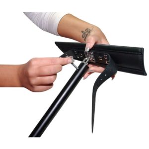 Bodenpranger-„Bausatz“ komplett mit Montagezubehör und zwei verschieden langen Stützen für die Halsfessel. Mit wenigen Handgriffen lässt sich der Pranger ruckzuck auf- und abbauen: Einfach an dem in der Länge verstellbaren, schnell zusammen montierten Metallgestell die weich gepolsterten Fesseln für Hals, Hände und Füße befestigen. Alle Fesseln sind mit Schnallenverschlüssen. mehrfach verstellbar. Schwarz. Material: Spaltleder, Leder, Metall.