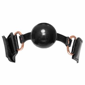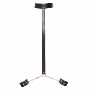 Knebel mit Handfesseln von Bad Kitty in stilvoller Lederoptik mit roségoldfarbenen Metalldetails. An dem Kopfriemen des Knebels ist hinten der Verbindungsriemen für die Handfesseln befestigt. Der Knebel wird umgelegt und die Hände auf dem Rücken dann außer Gefecht gesetzt. Die komfortablen Fesseln und der Kopfriemen des Knebels sind mit Klettverschlüssen schnell angelegt und im Umfang passend verstellbar. Handfesseln jeweils mit Ring, kurzer Kette und Karabinerhaken – vom Verbindungsriemen mit Ring abnehmbar.