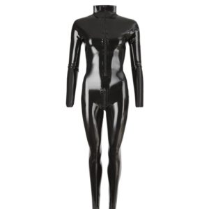 Schwarzer, leicht taillierter Ganzkörper-Anzug mit Stehkragen. Ein 50 cm langer Reißverschluss in der Front und ein Reißverschluss im Schritt können zur Belüftung und für Zugriffe geöffnet werden.