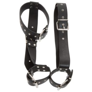 Robuste Konstruktion aus Hals- und Taillenriemen mit stabil angenietetem Rückenriemen, an dem übereinander die Fesseln für die rechte und die linke Hand angebracht sind. Alle Riemen sind per Schnallen mehrfach verstellbar. Schwarzes Lederimitat.