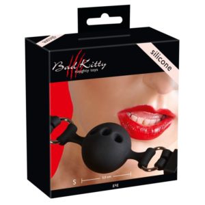 Schwarzer Knebel mit Luftlöchern fürs lange Durchhalten und verstellbarem Riemen. Knebel-Ø 3,5 cm. Material: Silikon.