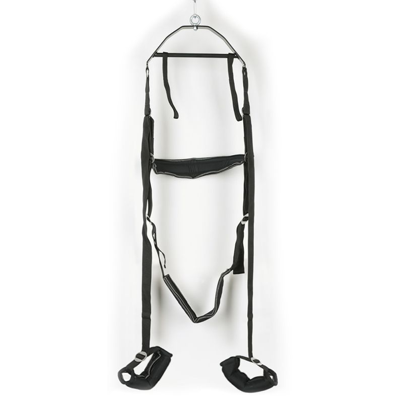 Stellungen, die im Bett „technisch“ unmöglich sind, werden mit dieser schwarzen Schaukel zum neuen Lust-Vergnügen. Trage- und Aufbaukonstruktion (Traverse) 38 cm breit. Gurte, Hand- und Fußschlaufen aus reißfestem Nylon, gepolstert und längenverstellbar. Belastbar bis 100 kg. Inklusive Peitsche (38 cm lang) mit 8 Striemen und Ledergriff, Augenmaske und Montage-Zubehör.