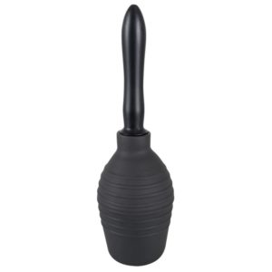 Schwarze Intimdusche (13 cm hoch, Fassungsvermögen 300 ml) mit zwei austauschbaren Schraub-Aufsätzen mit Spritzdüsen. Einfach zu reinigen. Langer, gewellter Aufsatz: Gesamtlänge ca. 23 cm, Ø 1,7-3 cm. Kurzer, glatter Aufsatz: ca. 11,5 cm lang Ø 1,9-2,3 cm). Material: PVC.