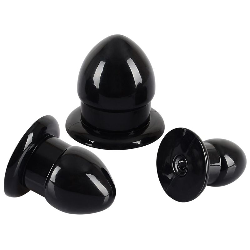 Drei schwarz-glänzende Analplugs/-dehner im Set, jeweils mit Standfuß/Stopper. Beginnen Sie mit dem kleinen Analplug (Gesamtlänge 5,2 cm) und genießen Sie 4,5 cm Einführtiefe bei max. 3 cm Durchmesser in Ihrem Hintereingang und steigern Sie sich mit dem mittleren Plug (Gesamtlänge 5,7 cm) und seinen 5 cm Einführtiefe bei einem Durchmesser von max. 3,9 cm. Und wenn Sie Ihre anale Freude noch mehr hochtreiben möchten, greifen Sie zum größten Plug (Gesamtlänge 6,2 cm) mit 5,7 cm Einführtiefe und einem stattlichen Durchmesser von max. 4,9 cm.