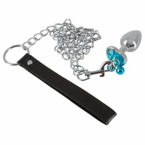 4-teiliges Butt Plug Set with a Leash von You2Toys mit 3 verschieden großen Plugs plus Kettenleine. Jeder Plug mit Anus schmückendem Stopper in Herzform, an dem 2 bimmelnde Glöckchen und ein Ring befestigt sind. An den Ring kann für Kontroll- und Führungsspiele die beiliegende Kettenleine mit dem Karabiner eingehängt werden. Kettenleine mit Handschlaufe in Lederoptik. Die Plugs aus Aluminium können für noch raffiniertere Empfindungen Im Wasserbad erwärmt oder im Kühlschrank abgekühlt werden.