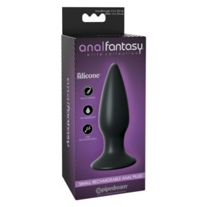 Schwarzer Analplug mit 7-Stufen-Vibration per Knopfdruck. Mit Rückholgriff und wasserdicht. Inklusive USB-Ladekabel.