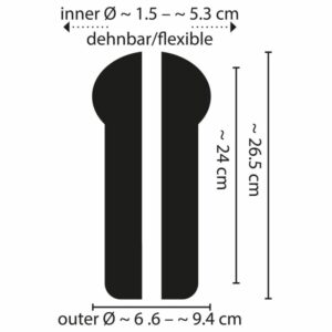 Gesamtlänge 26,2 cm, Einführtiefe 24 cm, Innen-Ø 1,5 cm (dehnbar bis max. 5,3 cm), Außen-Ø 6,6 cm bis 8,8 cm. 689 g. TPE, ABS.