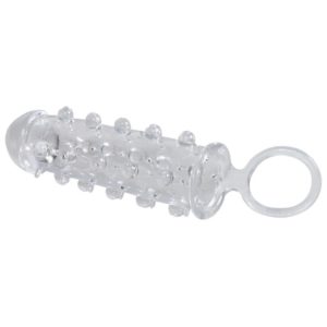 Transparente Penishülle mit 2-cm-Verlängerung, Reiznoppen und Hodenring! Auch passend für Dildo und Vibrator. Hülle in Länge 11 cm und Ø 3 xm (extrem dehnbar). Material: TPE.