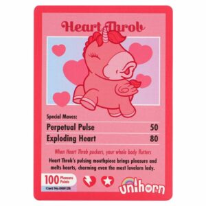 Niedlicher Auflegevibrator Heart Throb (The Pulsing One) von Unihorn in Form eines kleinen Einhorns. Das weiche griffige Silikon-Toy verwöhnt intensiv mit Vibrationen und seinem intensiv pochend-pulsierenden Schnäuzchen. Der Deluxe-Doppelmotor sorgt dabei für zuverlässige Power. Bequem per Knopfdruck sind jeweils 10 verschiedene Modi der Vibrationen und Klopf-Impulse getrennt steuerbar. Ein magisches Toy für vielseitige Spiele – allein oder zu zweit – zuhause oder unterwegs!