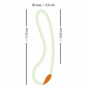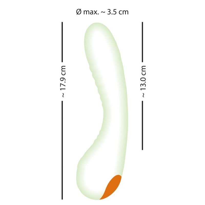 Ideal gebogen ist der rillenstrukturierte Leucht-Vibrator nicht nur zur G-Zonen-Stimulation geeignet. Seine abgerundete Spitze eignet sich auch perfekt zur Stimulation aller äußeren Lustpunkte und der analen Region. Ein echtes Highlight beim Solo- und Liebesspiel in geheimnisvoller Dunkelheit!