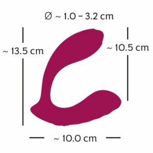 Gesamtlänge 13,5 cm, Einführlänge G-Punkt-Vibrator 10,5 cm, Klitoris-Stimulator 10 cm; Ø 1 cm – 3,2 cm. Gewicht 110 g. Silikon, PU.